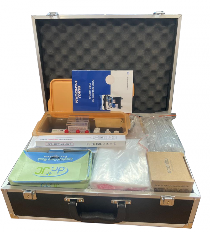 Rapid Test Food Security Kit type SAFE-02N merupakan alat uji kontaminasi atau uji kandungan zat yang dilarang pada makanan, Uji Cepat Rapid Test Kit Makanan sangat cocok dipergunakan oleh team Sanitasi untuk melakukan tugasnya dalam hal pengawasan dan pengujian pemeriksaan makanan yang beredar agar terhidar dari keracunan. Rapid Test Food Test Kit SAFE-02N pada Makanan untuk Uji Formalin, Boraks, Nitrit, Pestisida dan uji Ayam Tiren (Ayam Bangkai) sangat cocok dipergunakan pada Usaha Katering, Jajanan Anak sekolah, Hotel, Kantin, Pasar Tradisional, makanan tamu VVIP, Makanan Anak Sekolah (Makan Bergizi Gratis - MBG) dan sebagainyaRapid Test Food Security Kit